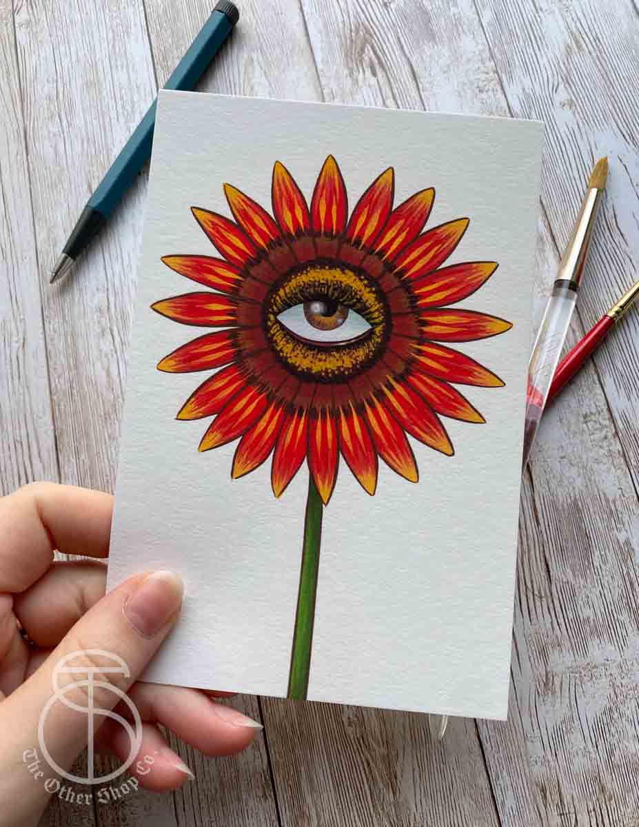 This Flower Eye Art Print features a vibrant orange flower with a unique twist - a mesmerizing eye in the center. Bring a touch of whimsy and intrigue to any room with this playful and eye-catching piece.
